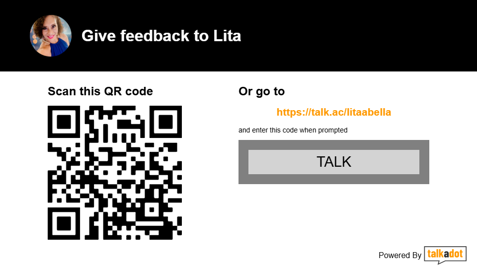 If you are a public speaker and want to get instant feedback from your audience and statistics on your events, Talkadot is an amazing tool to use. Talkadot is a speaker booking platform that makes the industry work better for everyone. It uses real audience feedback and data-driven insights to help speakers get booked for the right events and help planners find and book proven speakers with confidence. For more information about the company, check it out here or scan the QR code.